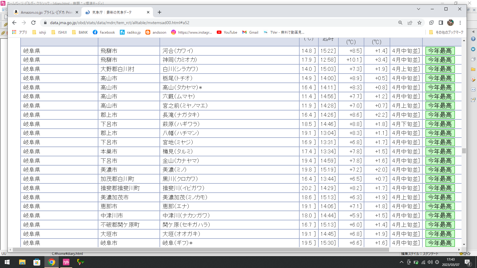 閑話休題。今日も、最高気温が更新された。岐阜県内すべての観測地点で、今季最高の気温だった。これで、今週の月曜日から4日間毎日更新されたことになった。