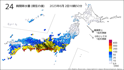 予報通り、台風2号の東へと進路を変えたら、湿った空気が梅雨前線を刺激して、朝から大雨となった。県内でも東濃地方に大雨が降ったらしく、交通情報も避難情報も中津川や恵那の地名が多く聞かれた。画像は、24時間の降水量を色分けしたもの、太平洋沿岸の地域に多く降っている。 |