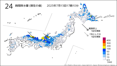 朝の8時過ぎだったか…。それまで降っていた雨はシトシト雨だったが、急に雷鳴とともに、とんでもない猛烈な先が見えないくらいの、怖いと思えるほど豪雨があった。およそ30分間くらい降った後も、雨は降り続いた。画像は、24時間の降水量の色分布。北陸地方から岐阜への帯状の色が濃いことがよくわかる。 |