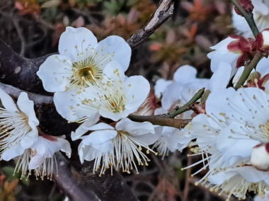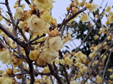 朝の6時半からの散歩。この時間では灰色の雲が空一面におおい、日の出すら見えなかった。そのためか?今朝は寒さは感じない散歩となった。途中のある神社の境内に咲いている梅を見つけ、畑では蠟梅も見つけた。今日は、立春。春が来た!!