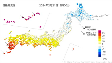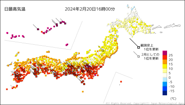 曇り空だったが、気温は驚きの、21.2℃。今年最高や2月の観測史上最高のコトバがずらりと並んだ。日本列島の太平洋側は、真っ赤色である。4月下旬並みの気温となったらしい。異常気象である。 |