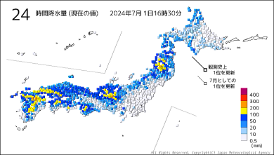 7月の始まりは、大雨。一日中降り続いた。それも、大雨となった。画像は、降水量の色分布で、これを見ると、九州から山陰、北陸地方で雨が多く降っているようだ。大雨のお蔭で電話注文が数件あって、ありがたいことです。 |