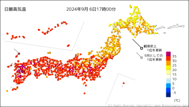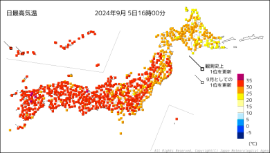 今日も猛暑日に一歩手前になる最高気温。暑かった。今日の最高気温の色分布をみると、北から確実に秋になってきていることが分かる。 |