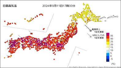 これが、今日の最高気温の色分布。9月ももう半ばになろうとしているのに、異常な暑さだ。35.7℃の猛暑日。 |