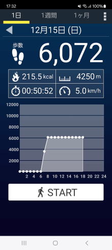 よく晴れた空のときの朝は寒さが厳しかったんですが、いつものように散歩に出ました。師走;12月も半ばになりました。年賀状は、先日デザインを決めて印刷を済ませました。年賀状の受付も、今日:15日から始まりました。今年も残り15日あまりで、お仕事モードも10日間程度でしょう。ここ最近は、年末だからって、なにか特別なことはしません。旅行も、もちろんしないです。画像は、今日これまでの歩数ですが、そのほとんどは朝の散歩の数字です。 |