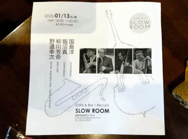 三連休の最終日。夕方から、市内の SLOW ROOMってところで、FREE JAZZのライヴのお誘いがあったのでお出かけ。アルトサックスとテナーサックス、バスクラリネットの二人と、ベースが二人の組み合わせで