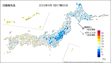 閑話休題。それにしても、ここ数日の寒さはいったいナンなんだろう。肌寒さのなか、サクラが咲いているのはなんとも異様に見えて仕方がない。画像は、今日の最高気温の色分布。春とは思えない。 |