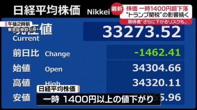 閑話休題。日経新聞の見出しは、こうだ。「日平均株価が大幅続落、34000円割れ」。ランプ関税の発動により、今日も株価は急降下した。どこまで下がるのか?底が見えない状況だ。 |