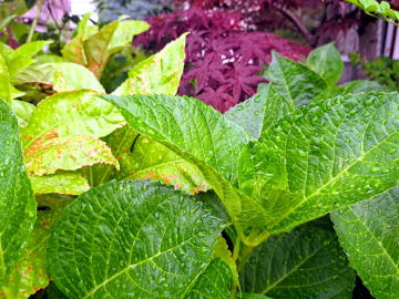 夜半の雨はやみ、曇り空。ちょっと気温が高いようなので蒸し暑い朝に散歩に出ました。昼間も風通しの悪い部屋ではムシムシした空気が感じられました。今日の最高気温は、陽射しがなかったのに、29.7℃となった。湿気があって高温ともなれば、こうなるのだろう。もう梅雨のときのような気候になった。紫陽花の新しい葉が雨に濡れた姿は、この時季らしい。今日は、FamousDoorも定休日なので、お出かけせず、スーパーに買い物に出ただけ…。 |