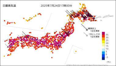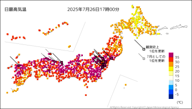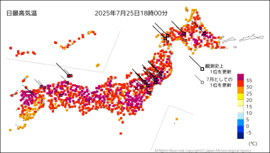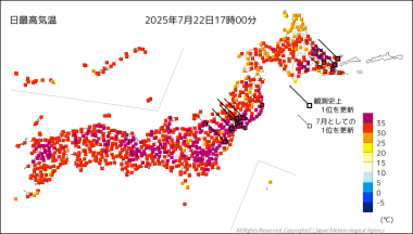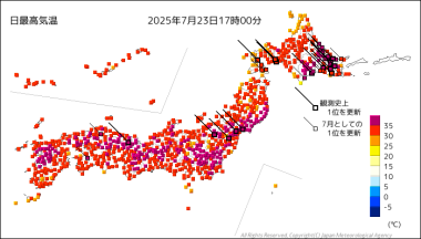 今日も猛暑日。これで四日連続となる。最高気温は日に日に上昇していて、昨日より暑い。画像を見て分かるように北海道で「観測史上1位を更新」のマークが並んでいる。北見市では、39度にもなった。最高気温ランキングで、北海道の地点が4か所もある。南の海上には、台風が3個もある。これまでには考えられない気象現象が表れている。 |