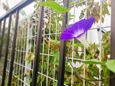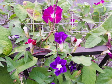 散歩の途中で見かける朝顔の観察。今朝は、みっつの花が咲いていた。それぞれの花の色が鮮やかで、とても綺麗で、、ちょっと元気をもらった。 |
