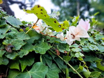 その朝顔、この二日間花が咲いていない。いつも写真を撮っているので不審者と思われたんでしょうか? 初めてこの朝顔のお宅の奥さんとお話ししました。「毎年たくさんの花を咲かせてくれるのに、今年は花が少なくて残念です」「根っこも葉っぱもこの暑さで傷んでしまっています」と、、花が少なくて咲かないのを残念がっておいででした。帰ってから去年の画像を調べてみたら、、去年の朝顔の写真がありました。左側が去年、右側が今年です。かしかに、葉っぱは多いし色も違うし、花もたくさん咲いていますね。 |