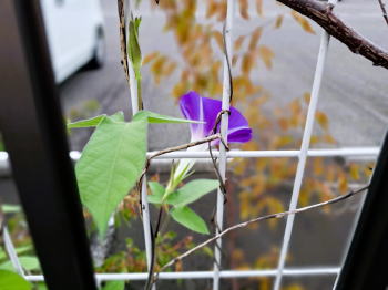 閑話休題。ご近所の朝顔、、雨だったためしばらく咲いていなかったが、今朝は一輪だけ咲いていた。その花も、やはり今年は小さい。朝顔の花の色が綺麗だ。 |