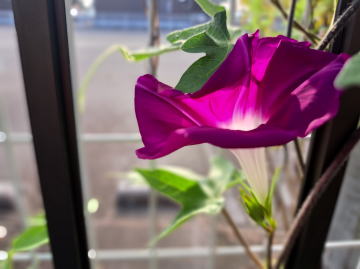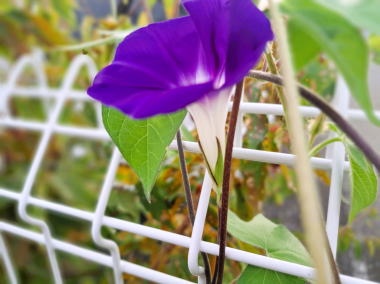 久しぶりの青空。それで、また暑さが戻ってきた。猛暑日にはならなかったが、夜の最低気温が熱帯夜で辛い。今日こそは、一日中家にこもり、一歩も外に? いや!朝顔の観察とともに朝散歩はした。今日も、一輪だけ咲いていた。今日の朝顔は、前のより色が濃くて鮮やかに見えた。 |