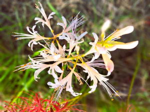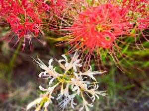 風で集められた落ち葉。稲を天日干しする懐かしい風景。曼殊沙華。