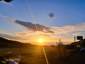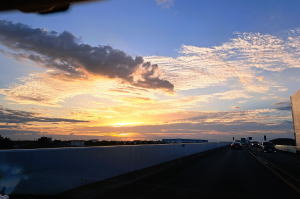 昨日と違い、風は爽やか、空は高く青空で秋らしい天気。ほとんど、車のエアコンはOFFのまま、窓を開けて走っていた。泊まったビジネスホテルの駐車場で、赤と白の曼殊沙華を見つけた。そして、帰り道に気鋭な夕焼け空も見えた。