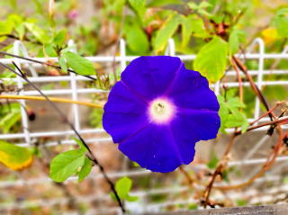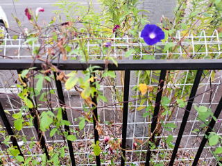 今朝、久しぶりに朝顔を見てきた。花の時季ももうお終いなのかもしれない。一輪だけ咲いていた。