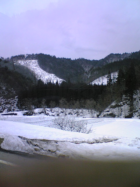 早朝から遠方出張。先月、この地方に出張したときは、超一級の寒波が到来していたときで、国道が凍結していて大変だった。2月の底冷えした寒さから、わずかの日にちを経ただけで、この温度差には驚かされる。しかし、早春の飛騨路では、まだ春遠からじ…である。まだ雪がたくさん残っていた。岐阜では、午前中から雨が降り始めたそうだが、こちらの地方ではポツリポツリ程度の雨だった。 |