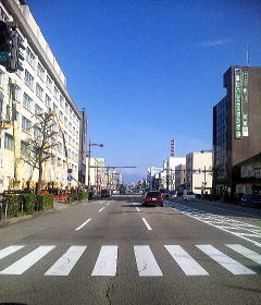 先日の寒さは何処へやら…。昨日につづいて雲ひとつなく、しかも暖かい。今朝も早朝から遠方出張。画像は、、、突き当たりには屏風のように聳え立つ立山連峰が望めるんだけど、うまく写真に写っていないようだ。まだ、雪に覆われていない山肌だから、コントラストもはっきりしないのだろう。しかし、この地は街の中心部の大通りだが、車の数が滅法少ないのは、何処も同じで悲しいことだ。 |