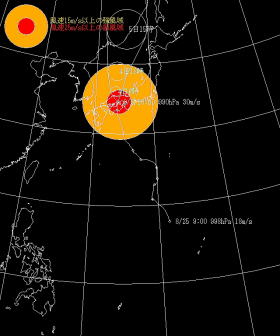 | 9月。台風が接近中だ。この台風12号、最初は関東を直撃する進路だったはずが、西へ西へと押しやられて関西へ向かうもようだ。この地方にいちばん影響をうけるのは、土曜となるらしい。 |