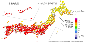 33.6℃…。秋らしさをいったん体験してしまうと、今日の暑さは猛暑日のような暑さに感じてしまう。日本列島が気温分布でこんなにも色分けがはっきりしてしまうのもめずらしい。 |