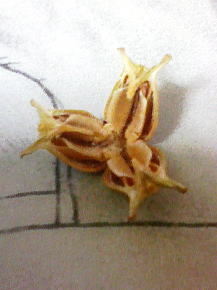 閑話休題。夕方に友人から、←この画像が添付されたメールをいただいた。「柘植の実」だそうだ。乾燥して弾け、中身の種が飛び出しあと…。木菟のように見えませんか?とコメントがありました。蝙蝠のようにも見えますね。 |