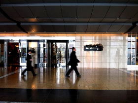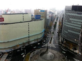 閑話休題。17階から見たJR名古屋駅前。真っ直ぐに伸びた道路が桜通り。駅前ロータリーの左側にあるのが、三菱地所のあの「大名古屋ビルヂング」。高層ビルに建て替えるため、現在解体中だ。「大名古屋ビルヂング」の屋上看板は、もう取り外されてしまっている。 |