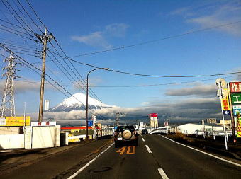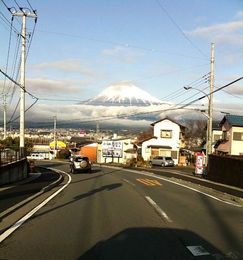 目覚めたときには土砂降りの大雨。その雨、営業地では午前中にはやんでしまった。画像は雨上がりの、雲がかかった富士山。今年の冬はやっぱり?寒いのだろう。いつにも増して、山頂から麓までの雪の範囲が多いように思った。 |