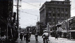 閑話休題。右にある大きな建物は、昭和5年に開業したデパートの「丸物」。昭和13年には8階建てに増築された…とのコメント。 |