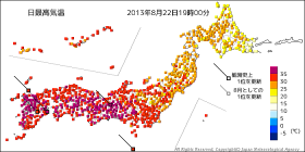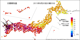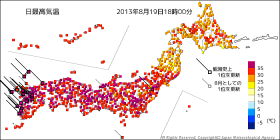 今日も暑かった!もうそろそろ秋風が吹いてもよさそうなのに。温度色分布をみると、見事に二等分されているようだ。 |