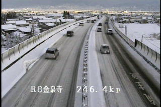 底冷えの寒さだ。今回の寒波は普段雪が降らないところでも積雪の便りがあること。雪の多い北陸もかなり降っているようだ。画像は富山市の国道8号線風景…。道が踏み固められた雪で真白だ。 |