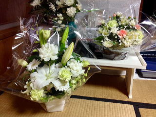 閑話休題。今日は母の誕生日。あっけなく逝ってしまったけれど、もう少し生きてくれていれば米寿だった。誕生日のお祝いの花をいただいた。そして、明日が七七日忌法要なので、お供えの花もいただいた。 |