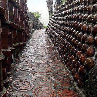 常滑の夜でさんざん飲んで、ビジネスホテルで一泊。早朝、雨が降るなか、常滑の「やきものさんぽ道」に行った。ここは、、朱泥の焼き物:土管などの焼き物で有名な街だったのを観光地として整備・保存されている地区を散策できるようにしたもの…。古い家屋を焼き物教室や喫茶店に改造したり、昨晩出かけたような酒場に変えているところが多い。早朝だったので、どの店もまだ開いておらず、坂道の登り下りを大きな荷物と傘を持ち、iPADでカメラ撮りするのはタイヘンだった。早々に、名鉄電車に乗り名古屋に向かい、JRに乗り換えて帰ってきた。 |