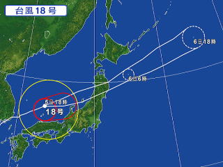 台風18号の進路が昨日から気がかりだったのは、二三日前から今朝まで。日本海を抜ける進路をみて、まずは一安心…。この地方に最接近する時間には、温帯低気圧に変わるわしい。 |