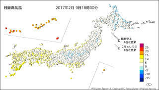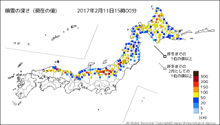 画像は、積雪の深さを色分けしたもの。祭日の朝…外は薄っすらと雪化粧していた。雪がたくさん積もる地方の方も、もちろんこちらの方も、、今になっての雪はもう邪魔と云うほかはないのだろう。雪で、かえって移動が困難になるので、本当に迷惑な雪だ。その雪、岐阜市は積雪1センチ。午後から、買い物で外に出たときも、また降り出し寒さが厳しかった。 |