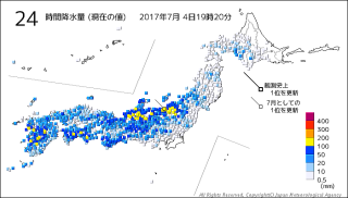 今日の画像は降水量の色分け分布。午前中は曇り空だったが、台風3号が近づくにつれて、午後から雨が降り出した。その雨の量が心配で早めに帰宅、、午後6時頃の帰宅となったが、結局帰路の時間帯がいちばん雨の降り方が強い時間だった。 |