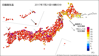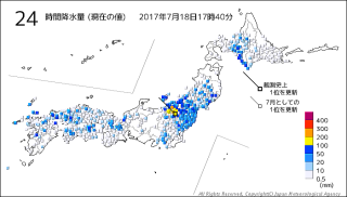 この画像は24時間の降水量を表している。この東海地方では、梅雨前線が北上することで梅雨明けとなることが多い。雨の地域はだいぶ北に移動していることが分かる。梅雨明け間近ってことなのだろう。 |