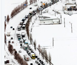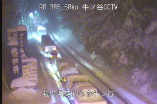 閑話休題。営業地の福井県地方の雪はとんでもない状況になっているらしい。積雪が1メートルを超えたところもある。国道8号も、ほとんど動かない状態らしい。昭和38年と56年以来の豪雪となっている。画像は、福井県と石川県の県境に近いところ、、車がまったく動いていない状況が見て取れる。 |
