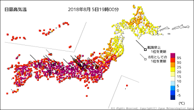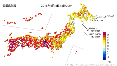 今日は、さすがに40℃超えの地点はなかったものの暑い一日となった。この暑さ、、東海地方だけやけに暑いようだ。とりわけ、岐阜県がいちばん暑い。「最高気温の高い方からランキング:トップ10は…」。下呂市・郡上市・美濃市・美濃加茂市・多治見市・岐阜市・中津川市と、県内の市がすらりと並び、他は名古屋市と浜松市。この地方が、特別暑い。こんな「夏」は初めてだ!! |