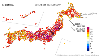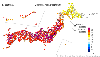 今日も熱帯夜と猛暑日の日となった。今朝早く颱風8号が九州に上陸して、今日一日中暴風と大雨だったようだ。そんな気象現象が、この温度分布にも明らかに表れている。去年の今頃は、40℃超えを記録する日々だった。今年はそれほどの高気温はないものの、湿度が高いので、、まとわりつくような蒸し暑さに閉口する。 |