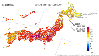 | 夜明け前の集中豪雨で目が覚めてしまった。その後、朝まで雨は降り続いた。去年もそうだったが、、お盆を過ぎてから急に秋っぽくなってきた。今日の最高気温は、27.4℃。午前1時19分の温度。最低気温は、22℃。これは、13時25分に記録されたもの。熱帯夜と猛暑日の連続日も、今日で途切れた。 |