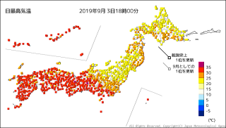 残暑が厳しい日となった。気温分布のこの色分けは極端だ。最高気温のランキングも、35.3℃で多治見が第一位。でも、真夏の最高気温と比べると、そんなに高くはない。今日の営業地も32.2℃だったらしいが、、それ以上の暑さを感じた。 |