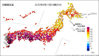 浜松市に編入された地区とは関係なく、、浜松市の中心の中区で、過去の最高気温と同じ 41.1℃を記録したらしい。海に面している浜松市が最高気温を記録なんて考えられない。そして、岐阜市でも今季最高の気温:39.2℃だった。この気温で仕事しようってのは、もう無理だろう。 |