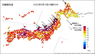 閑話休題。台風の南風で、、今日の最高気温は、新潟県や山形県、石川県の街がベスト10内に入った。とくに、新潟県の三条市や上越市は、40度超えの気温だった。 |