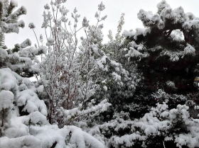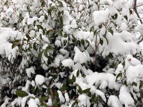 朝起きて新聞を取りに行くため外に出てびっくり。10cm近くの積雪。「もう雪はいらない」と思われる、こんな時季に雪降りなんて、驚きだ。雪は午前中まで、激しく降り続いた。しかし、地面は温かいのだろう。昼からの陽射しもあって、ほとんど溶けてしまった。 |