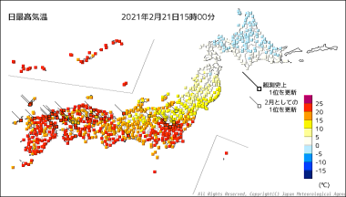 2月に、21℃という最高気温はめずらしくないのかもしれない!? それにしても? つい先日18日の木曜日は雪が降り積もったのに、わずか数日でこの暖かさ!?