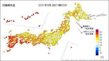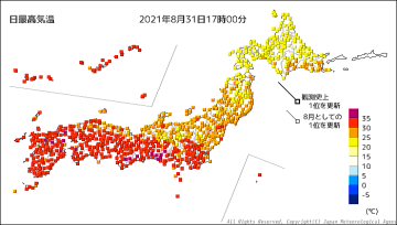 朝のうち、雷雨があった。その後は、ほとんど降らない曇り空の一日となった。なので、今日の気温は30℃以下。8月30日の温度分布画像と比べると、赤い地点が少なくなってきている。 |
