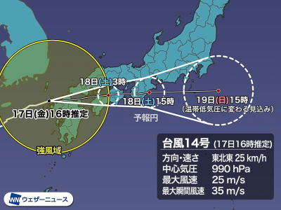 台風14号が東に動き出し、その影響で雨降り。この台風、、出来たころは超大型スーパー台風といわれていたが、停滞している間に普通の台風に衰退してきた。進路も、日本海に向かう予想だったが、九州から四国・近畿を通って太平洋に抜ける進路に変わってきた。今晩から、明日一日中、こちらに影響が出そうだ。 |