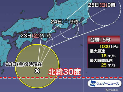 三連休にまたも台風が…。今回の台風15号は、日本近海で台風に変わり、そんなに大きくはない。風の心配より雨が多く降るらしい。この地方に最接近するのは、また深夜。 |
