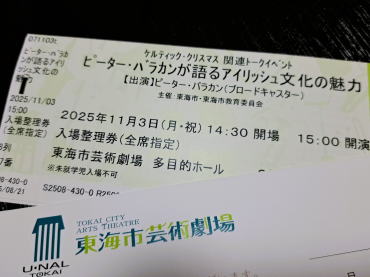 閑話休題。今日は、名古屋市の大高や大府方面の営業ラウンドだったので、東海市芸術劇場まで行き、11月3日に行われる「トークイベント【ピーターバラカンが語るアイリッシュ文化の魅力】」の入場整理券をいただいてきた。昨日、東海市芸術h劇場の公演イベントを見ていたら、この催しがあることを知り、、アイリッシュ音楽も大好きだし、ピーターバラカンのラジオ番組も聴いていて、、是非、参加したいとおもい、入場整理券をいただきに行った。素晴らしい会館だけど、夕方に中に入ると、高校生らしき生徒が遊んでいたり、自習していたり、電動の椅子でマッサージを楽しんでいるひとがいたり、ソファで寝ているものもいたりの風景。3階の事務局まで案内されて、無事に整理券をいただいた。その後、あと少し十数分南に行けば、加木屋なんだろうけど、、逢ってもくれないだろうし、いないかもしれないし、誰かと仲良く暮らしているだろうし、、また、名古屋方面に戻った。